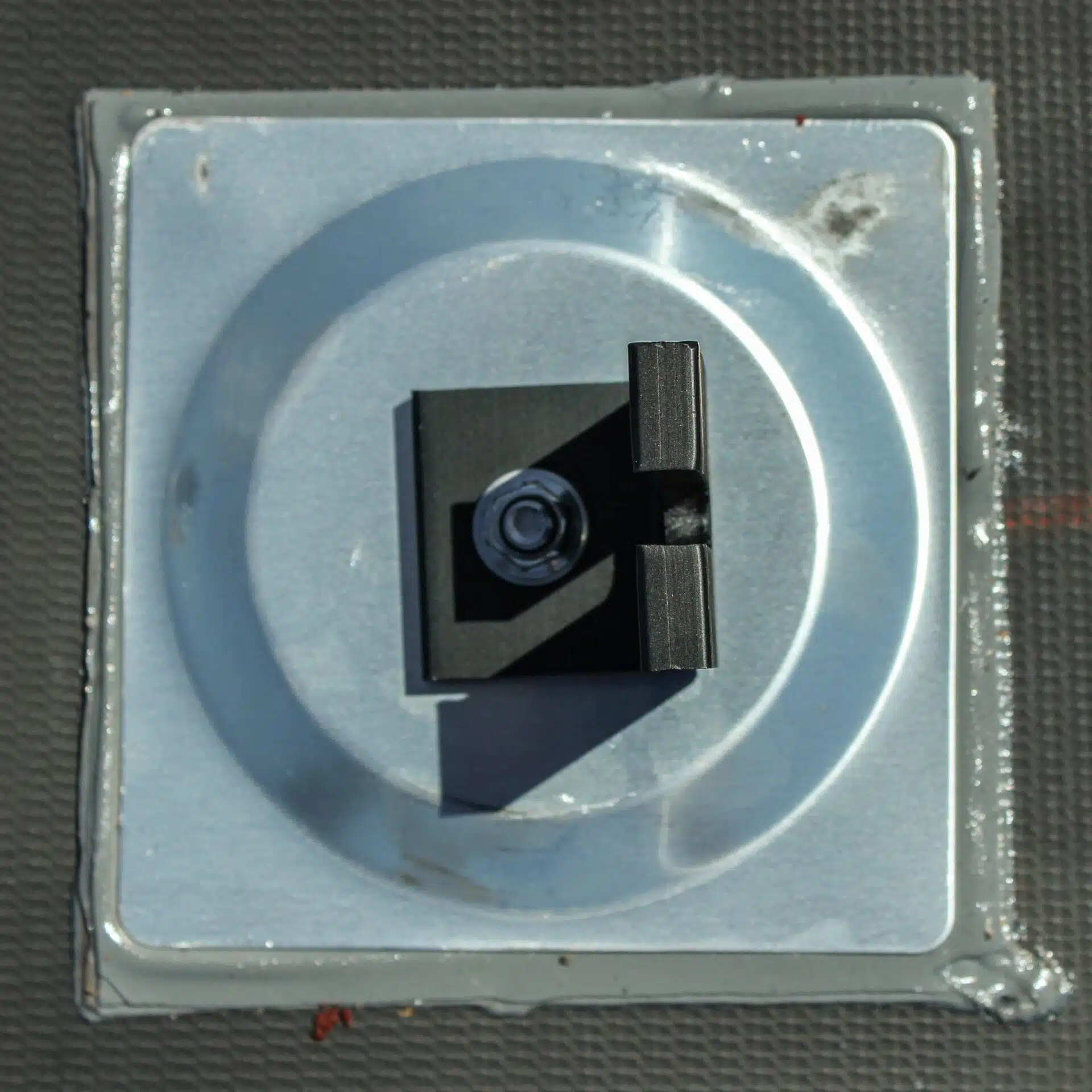 On top of the sealant material, we’d use a thin piece of silver metal called a “flashing”. This piece is specifically designed to keep water out when it bonds with the sealant underneath. As well, the black colored “L foot” is then attached to the flashing. It is attached with a lag bolt that goes through the flashing, through the sealant, and into the roof. This lag bolt, and thousands like it, are what keep the solar modules and associated hardware connected to the roof.